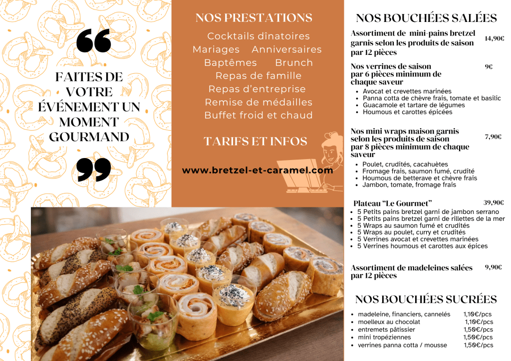 Chez Bretzel et Caramel, chaque bouchée est une invitation à la convivialité et au plaisir. Alors, que vous soyez en quête d’un déjeuner rapide, d’un dîner à partager ou d’un buffet pour vos événements, notre carte est là pour répondre à toutes vos envies gourmandes.