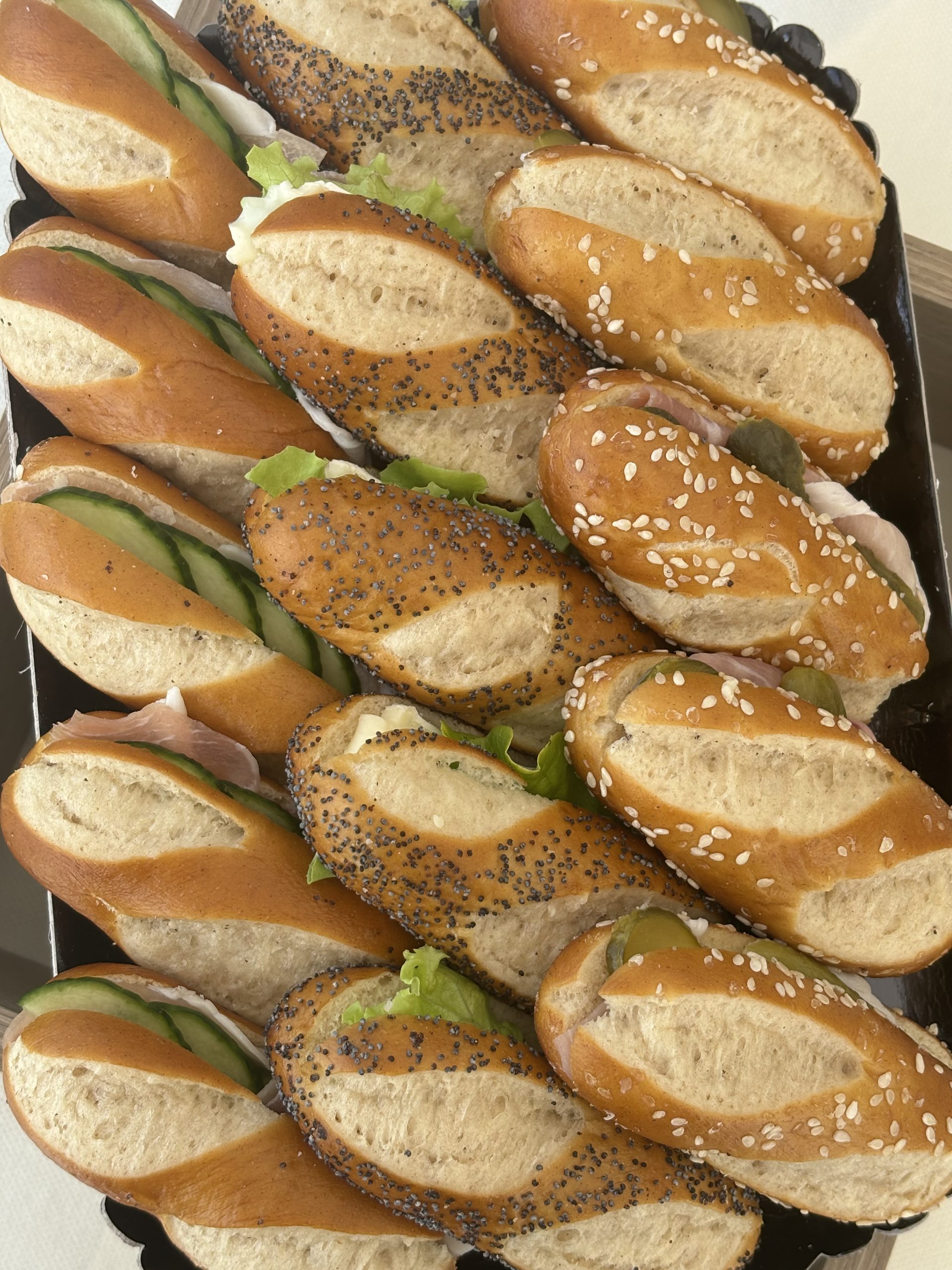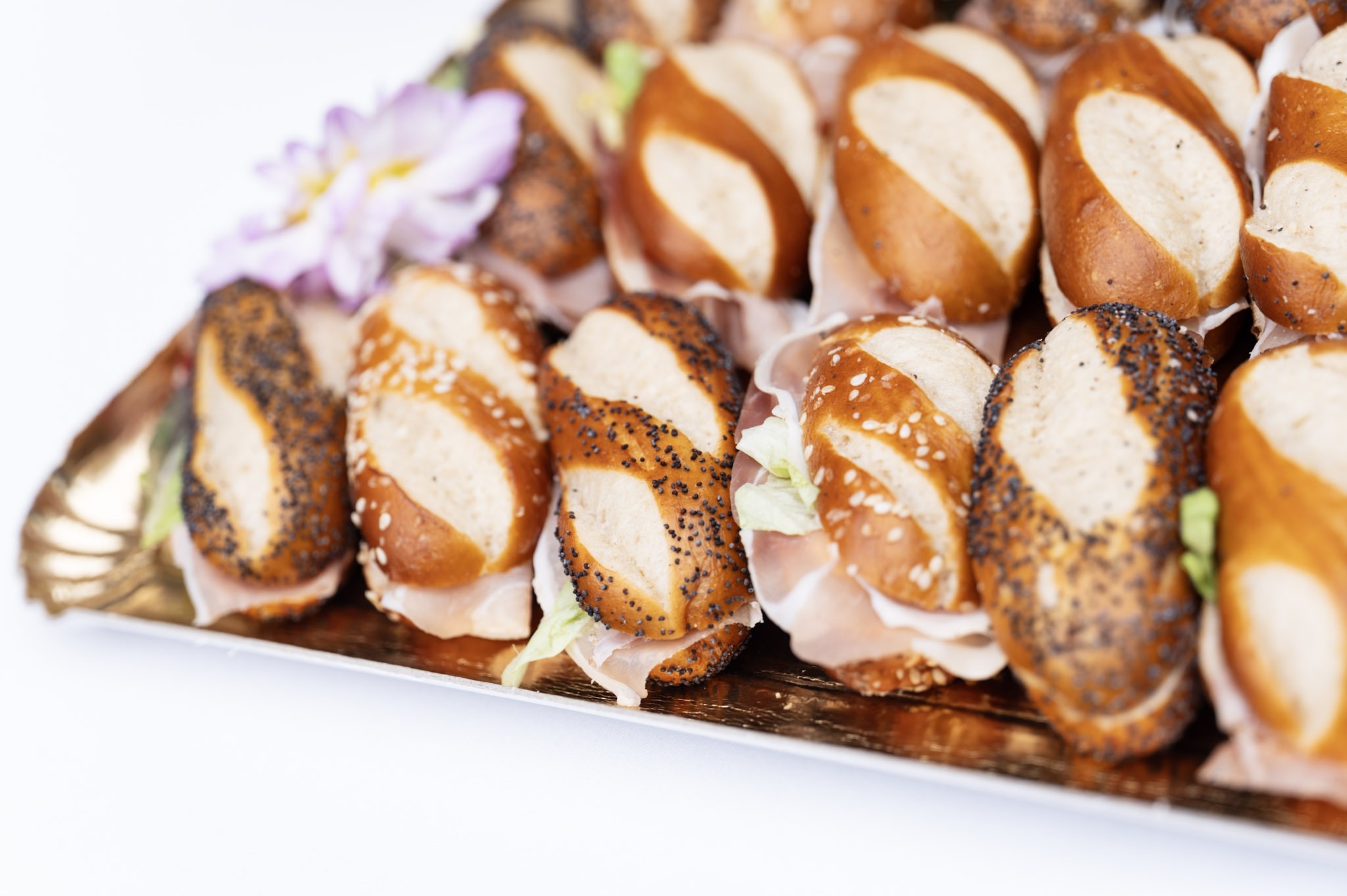 Découvrez notre assortiment de mini-pains bretzels garnis. Ce plateau réunit 12 bouchées gourmandes, préparées selon les produits de saison.