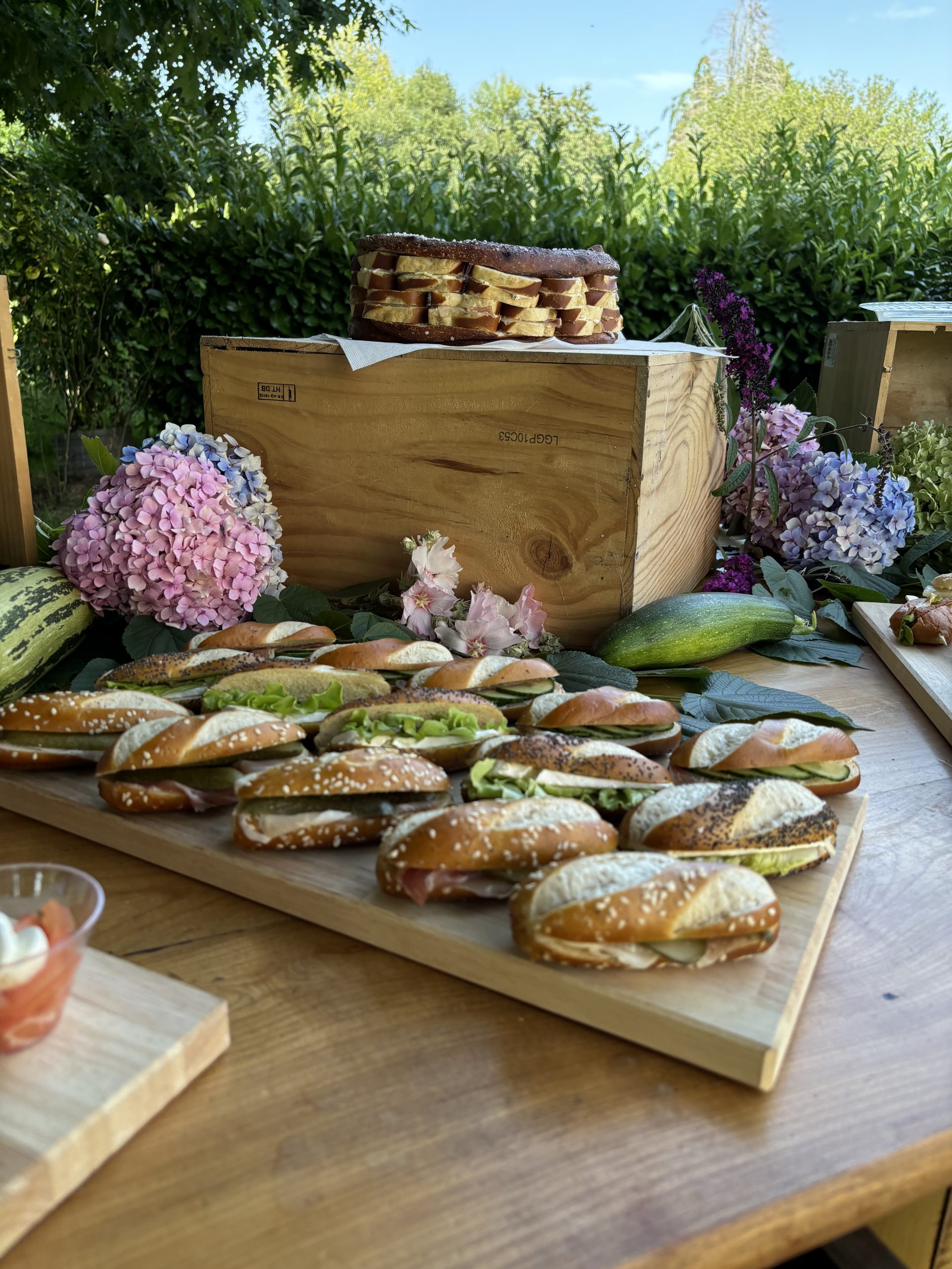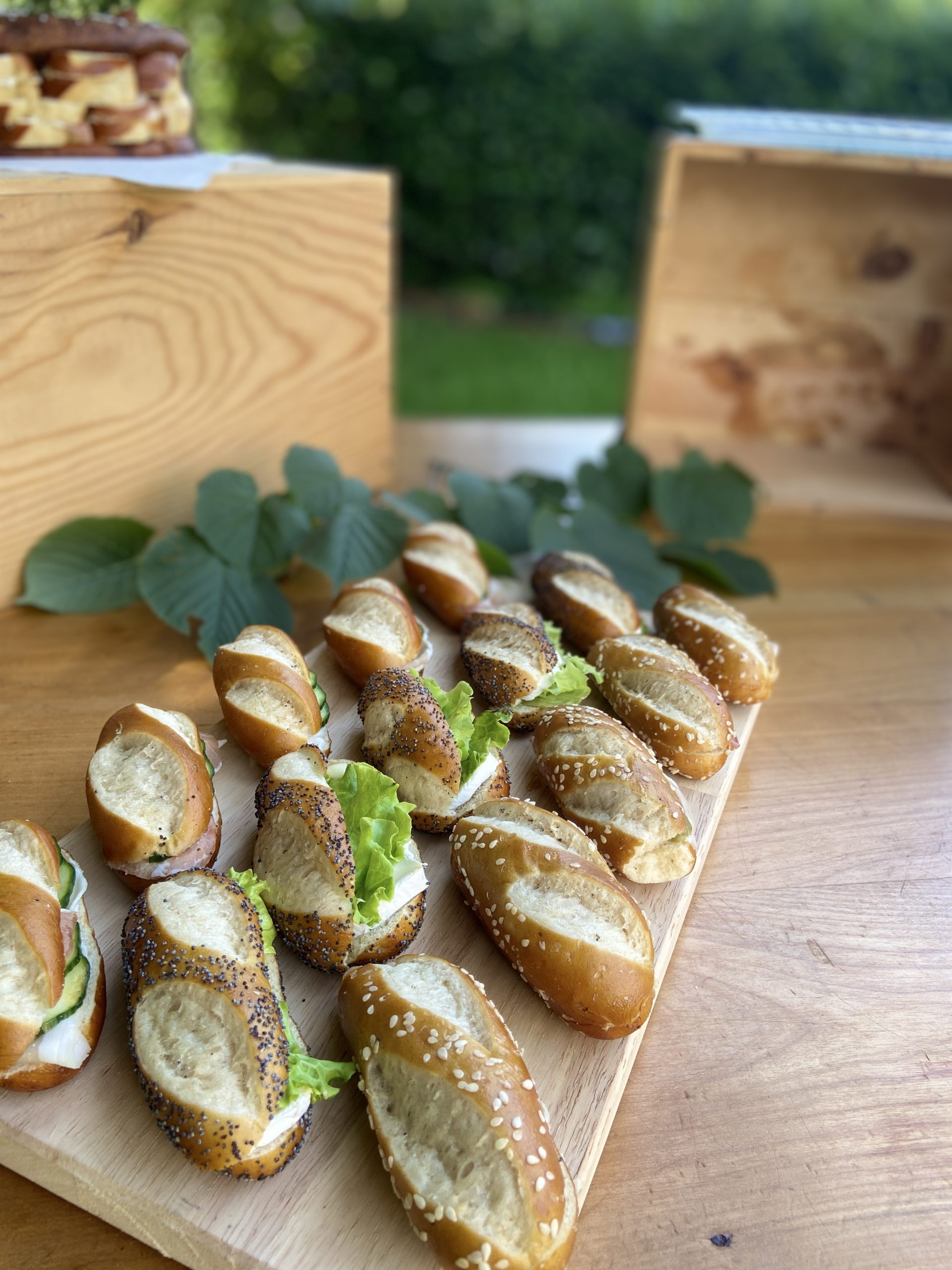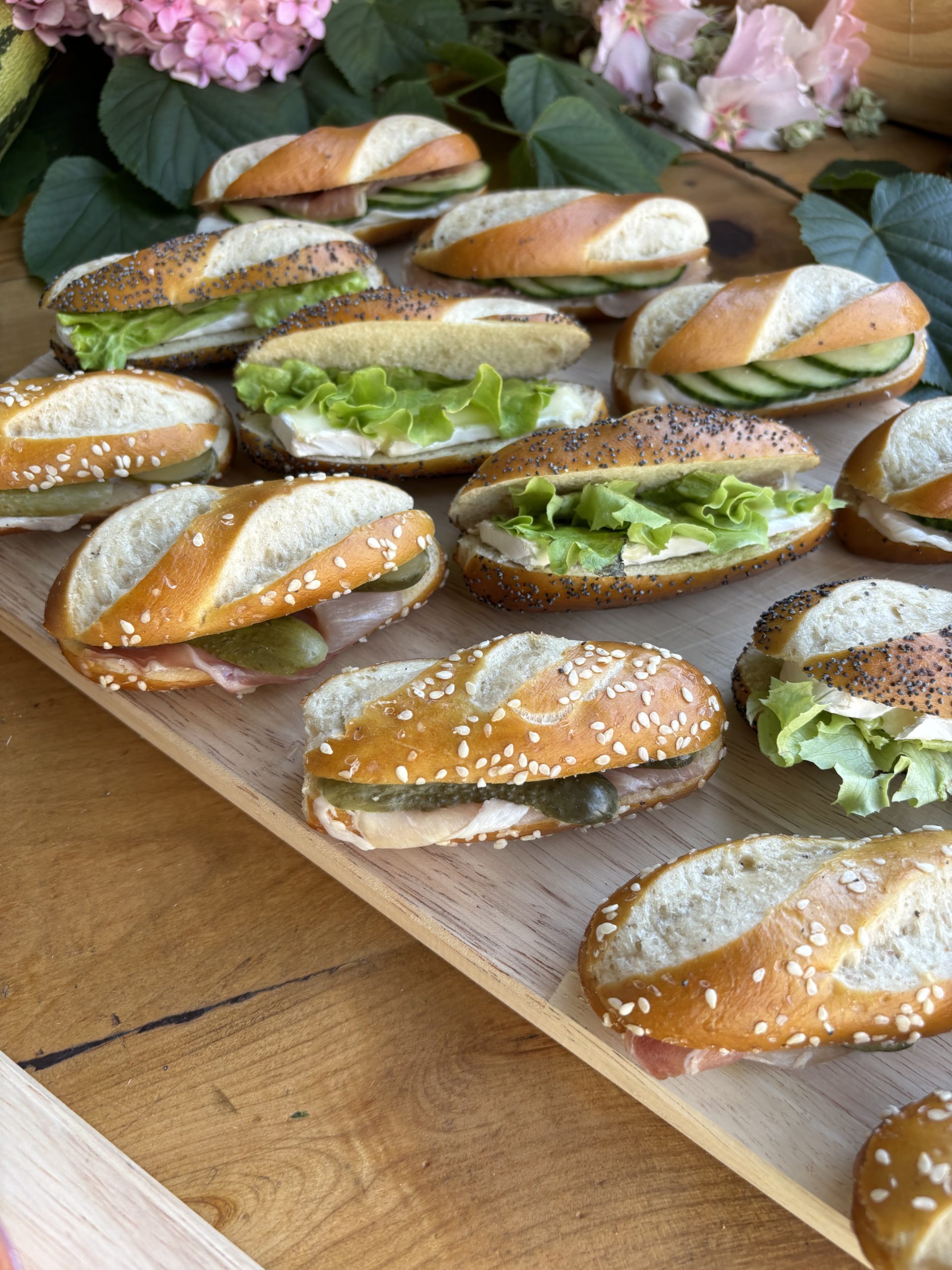 Nous composons chaque mini-pain bretzel garni selon l’inspiration du moment. Nous privilégions toujours la fraîcheur et l’équilibre des saveurs.